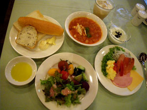 色とりどりの野菜がタップリ&パンも豊富&スープはミネストローネをセレクト・・・オリーブオイルもあるでよ〜