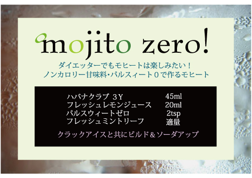 mojito7BARに待望のゼロキロカロリー登場! 糖分を気にせず美味しくモヒートを楽しみたいダイエッターの貴方に・・・ パルスィートゼロ独特の甘味にファンも多し。