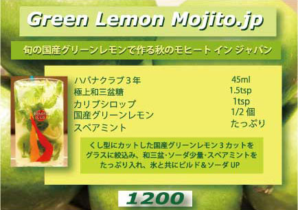 秋に旬を迎える国産グリーンレモンを使ったモヒート 瑞々しい緑の香味を存分に味わっていただくために くし型に切り種を取り除いたグリーンレモンを皮ごと投入 たっぷりのミントと極上和三盆糖を少しのソーダと共にペストルでプレス ハバナクラブ以外は純国産の味わいを 爽やかなこの季節に・・・是非 お楽しみください