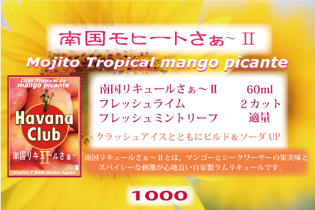 ガールズに人気の南国モヒートさ〜に新バージョン登場 新しい南国リキュールさ〜Uは、マンゴーとシークワーサーの エキゾチックな果実味に味を引き締めるスパイシーさをプラス。 さらに美味しくなったジャパントロピカルなモヒートを、 ぜひmojito7 BARでお楽しみください。