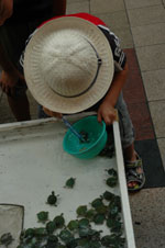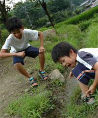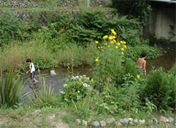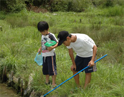 能勢の山田の水路に森青蛙を逃がしてあげる子供達