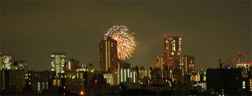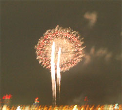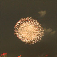 スプリングスひよしに戻り、ひと風呂浴びて花火会場に向かうが雨が強まる。 だが 去年と違い今年は花火が始ると共に雨は止み、会場は のどか ながら熱気に包まれる。 雨の為ご馳走設備を設営できないので、スーパーで買ったお寿司etc・・・を、