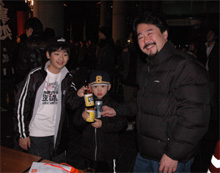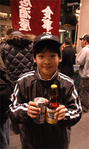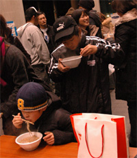 ついでに 気の良さそうなお兄ちゃんに「蕎麦は並ばんとあかんよなぁ・・・」と声を掛けると 「僕が何とかしてきます!」・・・嬉しいなぁ。 寒そうな子供達を不憫に思ってか、長蛇の列に構わず年越し蕎麦を回してくれた(後で怒られてたが・・・)。