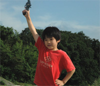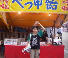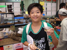 いつもの べっこう飴を買ってから、結局‘選べる3品定食’の店に。 食後は屋台で遊ばせた後、ヨーロッパの食品&ワインの展示会に向かう予定だったが、 あまり これと言って杜人の食指が動く屋台が無く、商店街はもう天4を過ぎそうに成ったとき 鰻釣りの様な小竿に糸と輪ゴムを付け、カブトムシを吊り上げる・・・といった具合だが 「お父さん 僕 くじ引きにするわ」・・・偉い!その方が賢い!