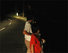 そして宿題が終わった夜8時前、摂津峡はすっかり闇に包まれる。 現場には既に2台の車が路側に停車中・・・居るで! 車を更に上流側に向け、路側に寄せて‘ライト オフ’・・・「お父さん 光ってる」!と子供たち。