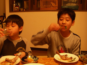 最高の焼加減な鶏のもも焼には、手加減無しに貪りまくる魔童たち。