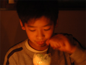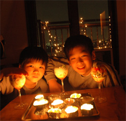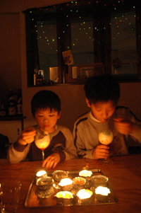 いよいよパフェが出来上がると、女っけ無しでもムーディーにキャンドル点灯。