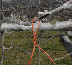 雪の残るリンゴ園、右の針金みたいなのは立派な除虫器具なのだ。