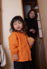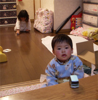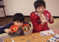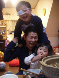 賑やかな食卓は、何よりも暖かい、私のお土産の温泉まんじゅうチョロQで遊ぶ子供たち。