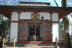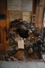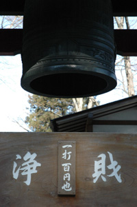 なぜかここだけ千社札ベタベタの堂&一打百円なりの鐘つき堂