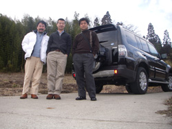 棚田の前で記念撮影、中央がK越氏、右はS木部長。