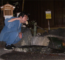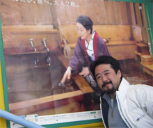 女ゆの暖簾をバックに、温泉カット第1号!