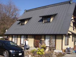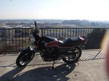 気持ちよく晴れた藤岡の朝、私の荷物を車に運んでくれるトビィ&彼の愛車CBX。