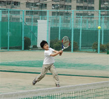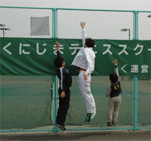 たけのこ掘りや、野蒜採り・こごみ採りなど自然豊かなお楽しみが有り、 今回は中川家も一緒なので、写真をサボってしまい 残念ながら前日の酒がしっかりと残り、 一夜あけると今日もさわやかに晴れた伊賀地方、 いつもながら朝ごはんの生卵が絶品の美味さ! チェックアウトを終えて、予約してもらっていた町営のテニスコートに向かう。 すごい日差しの中、悪がき連中相手にテニスコーチ。 伊勢慶の田中夫妻ペア 対 八木・中川オヤジペアで対戦したダブルスは、 私は1本の気持ち良いリターンエースを、 最後はテニスコートでフリスビー・・・いったい何やねん、アイツらって思われてるよなぁ。 楽しい青山の休日は、これでおしまい・・・ 相変わらず込み合っていたので、どうしてもやりたい子供たちだけ並ばせ