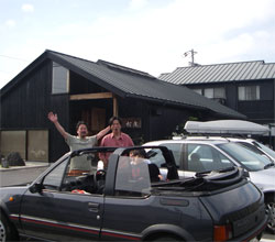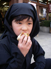 忍者らしく‘味噌焼きおにぎり’とお漬物で空腹を紛らわせ、 キクロー一家と合流し、今夜は青山の伊勢慶で宿泊予定である。 中川家がお昼を食べている間に、残る道場を制覇しようと手裏剣道場へ向かったが