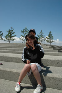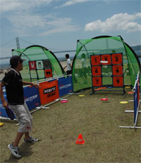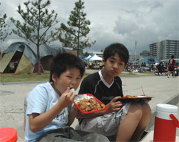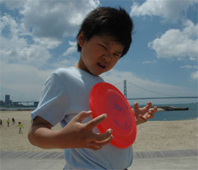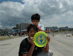 初日は詠人と2人だけの参加・・・ディスクゲッターで遊び、ミニ ドッジビーのキーホルダーをもらってご機嫌。 2日目は杜人も参加・・・しかしオヤジは前日のビーチアルティメットの影響で肉体崩壊・・・あぁ・・。