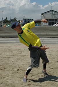 ビーチアルティメットの試合前、左はグレイ&右のガッツン。 一番左のユキちゃんは、この日の可愛い娘ちゃんNo1、キビキビよく動いてポイントGETしてました。