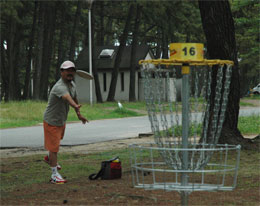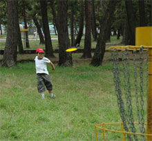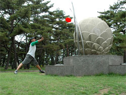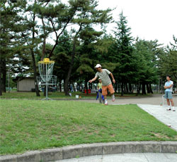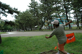 なにしろ初めてのコンペ、ルールやマナーなどクリアー出来ていない事も多いので 浜の宮公園のコースは、とにかく無数に林立する松の木の間を抜いて 上手い人を見ていると「嘘やろ」と思うほど、すっと抜けてスーッと伸びて行くのだが、 前半の16番では、新品のディスクを思い切って正面に向け飛ばしたものの 一緒に廻っていた人から「紅白歌合戦やなぁ」とか、 前半だけでかなりヘロヘロになり、18ホールを終えた。 「そうや!ビール飲んでないから調子出んのや」・・・と、