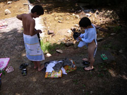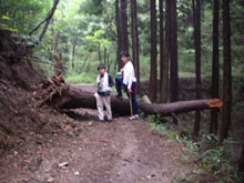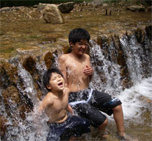 雨にぬれて山の中では結構体が冷えるので、お風呂はやっぱり嬉しい。 でも責任者の小出さんが事務所の前に転がってるミヤマを見つけ、杜人にくれました。 大阪でも最も標高の高い能勢の山の上は夏でも夜は冷え込む。 夜が明けて早速トラップの場所に向かうが、 しかしここは能勢、全国でも有数のクワガタ産地、諦めてはイケナイ。 丹念に建物の周りを探して廻ると・・・いました!ミヤマのメス、かなり大きい! とはいうものの、この日の朝は気温が低く、プールの開催には温度が低すぎて入れず仕舞い。 でも裏腹に天気はどんどん回復し気温は上がる一方・・・ プールが駄目なら川遊び・・・ようやくこの夏はじめて陽の光を受けて子供たちの笑顔がはじけた瞬間だ。