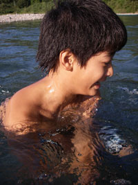 最初は恐る恐る川を眺める詠人と、入る勇気の無い杜人は石投げ遊び。