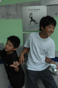 海がめの進化を勉強し、ティラノサウルスにも海がめにもなる子供たち。