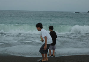 再チャレンジを懇願する子供たちに「来年また勉強して、また来よう」と諭し海岸へ。