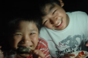 満面の笑顔の子供たち&タバコの火で詠人がいたずら作品を・・・こちらも笑顔?
