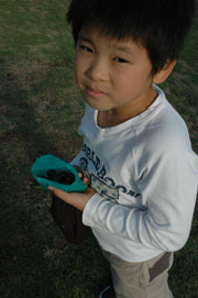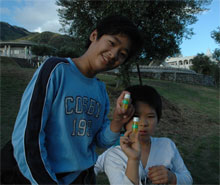 向かいの役場駐車場で子供たちとキャッチ&スローを楽しむ。