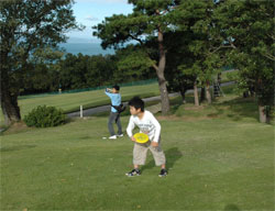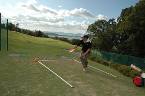 本部前のディスクマン、パット練習の詠人、綺麗に整備されたグリーン上で。