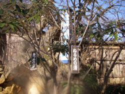 あつめ・ぬるめのお知らせ看板、あつめ奥の竹の扉の向こうがどうにも気になる