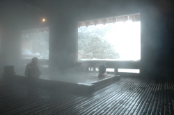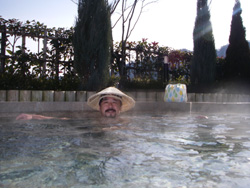 笠をかぶり一風呂・・・施設に風情が無いのが・・・