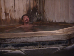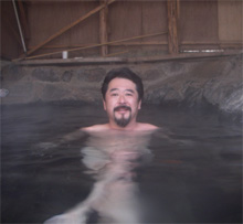 掘建て温泉で温まっていたら、近くの旅館主人に目の前の川原の奥を