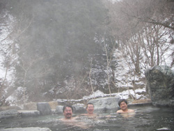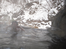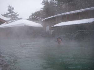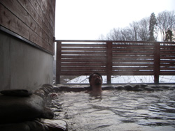 柔らかなお湯はほのかな硫黄臭、雪の景観の中ホッコリといい気持ち