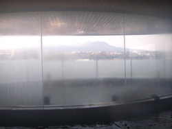 主浴槽と露天は大きなRが付いたガラスで仕切られるが、開放感は・・・確かに空は見えるが