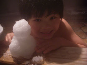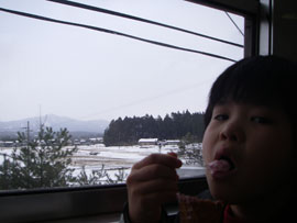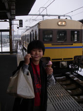 雪だるま作りに付き合ったオヤジは冷えた体を三度温泉に委ねるが、 駅弁を買い込んで、アイスを食べながら汽車を待つ。