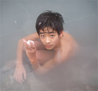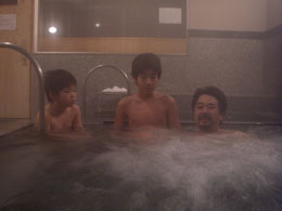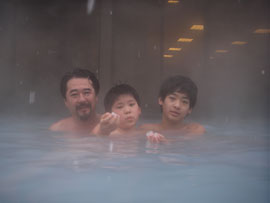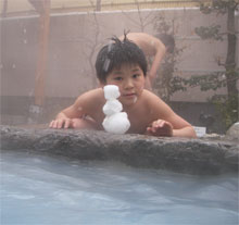 伊賀で何故か「草津の湯」がたたえられた露天風呂、杜人と詠人は やっぱり雪遊び。