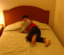 スウィートと言うだけあってベッドルームとリビングは分かれている・・・ベッドの上では悪がきが飛び跳ねる。