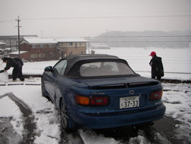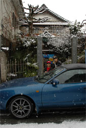楽豚の駐車場で・・・もうべちゃ雪に・・・大阪のほうが凄かった。