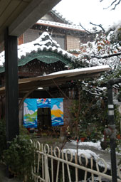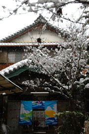 ほんのり雪化粧の千鳥破風&庭木と暖簾のコントラストが美しい&さすがに雪の日は屋根閉めてます。