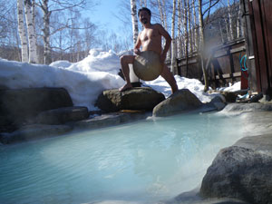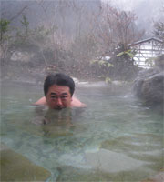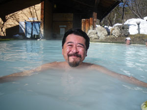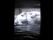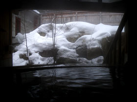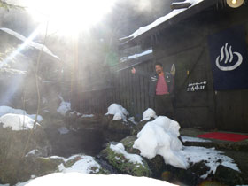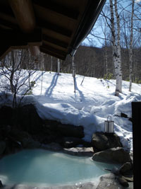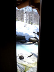 ベストな温度の褐色湯からは元気一杯の硫黄香が、周りを雪に囲まれ入る貸切り状態は極楽至極。