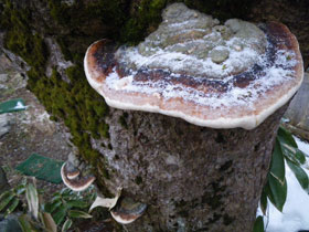 坂道を流れ下りる温泉から湯気が・・・、苔むした萱葺き屋根にできた氷柱たち