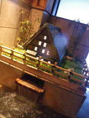 白川郷温泉から始まる1日、内湯の注湯口は合掌造りモデル、露天から望む景色