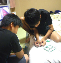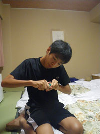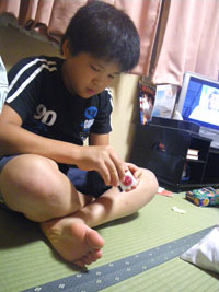 食後は夜店でGETした、中国製えせベイブレードを組み上げる杜人。