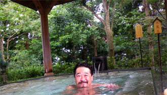 露天の大浴槽奥は背湯が流れる寝転びスペース、露天水風呂大好きの変態オヤジ