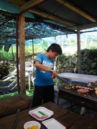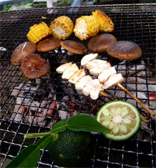 働き者の詠人・椎茸の軸を串に刺して・・・柚子しぼって、気の利かん食べ盛りは黙々と・・・