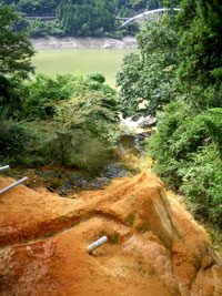 温泉の溢れるダム湖への斜面はもちろんカピカピ