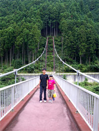 「友愛橋」の階段を登ると丸い木のスペースが現れる、赤い橋は深い緑の針葉樹に映える。
