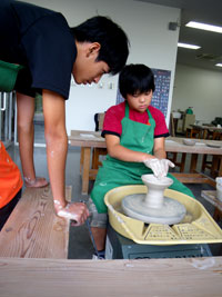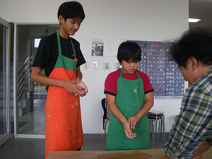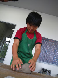 先生の土練り講義を真剣に聞き入る子供たち、難しくて思うように練れない詠人