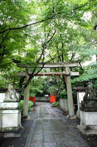 小雨が杜を濡らし、神社の赤がより一層深く鮮やかになっている。
