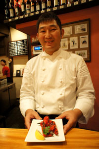 マンサニージャのアテを頼んだら、赤万願寺のマリネを出してくれた鈴木シェフ